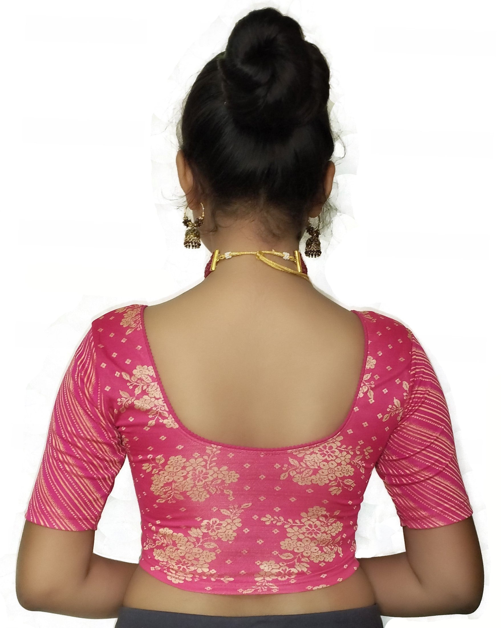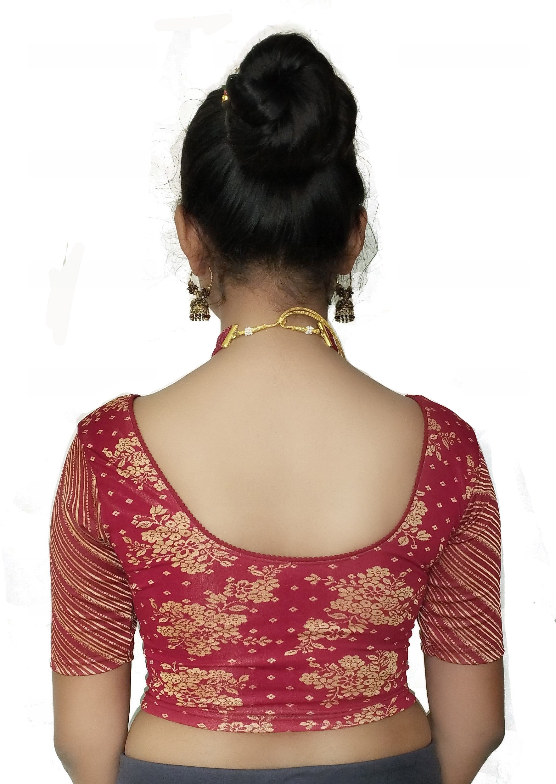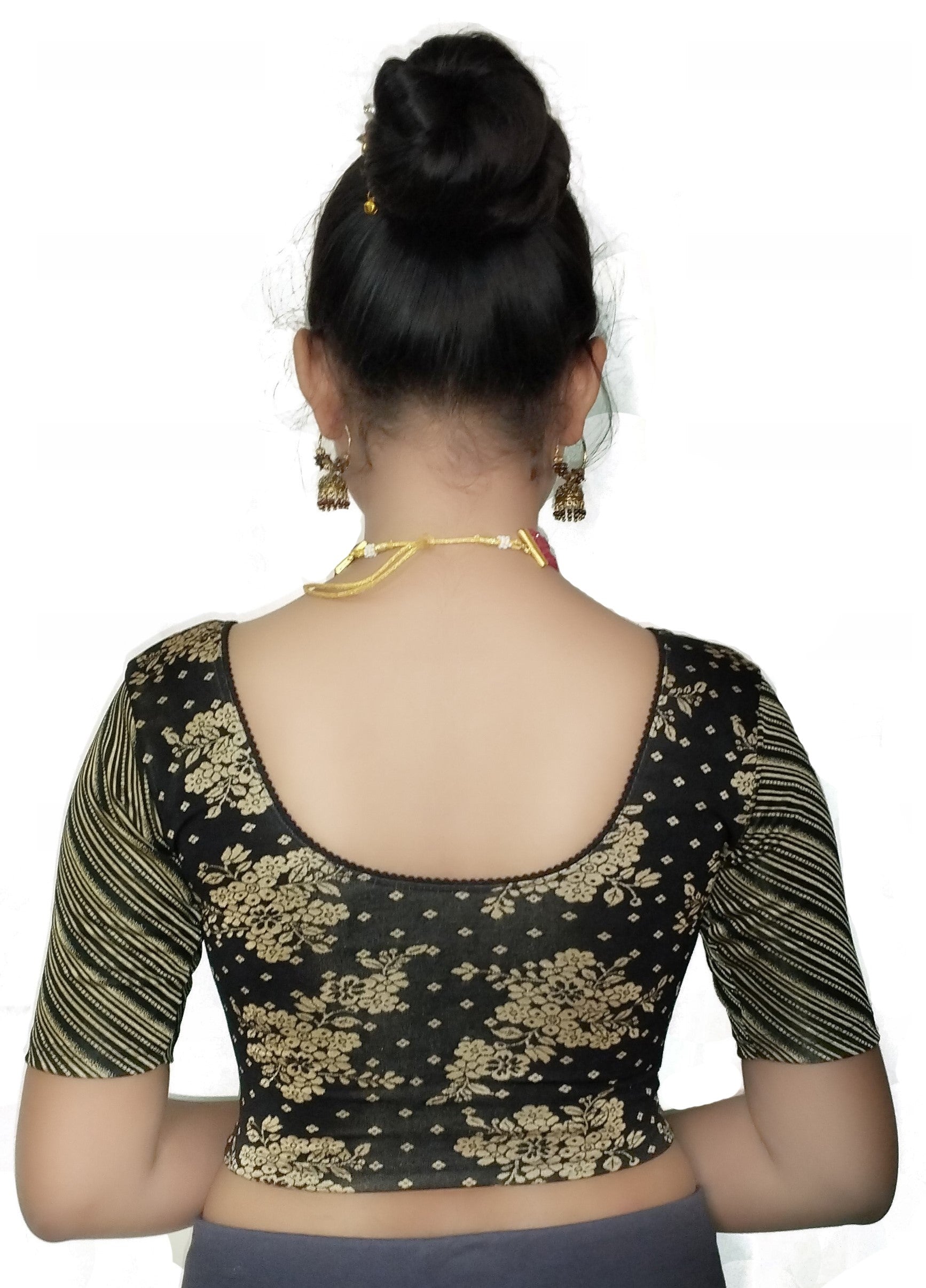 PU Fashion Jacquard Stretchable Saree Blouse – Floral Round Neck Short Sleeve Design