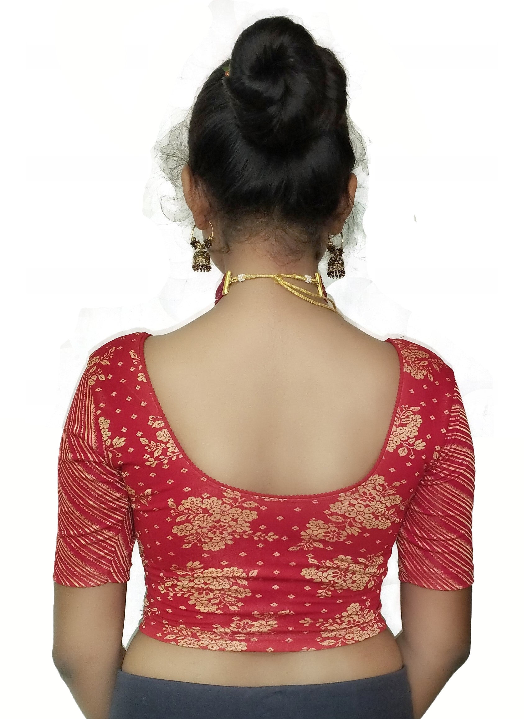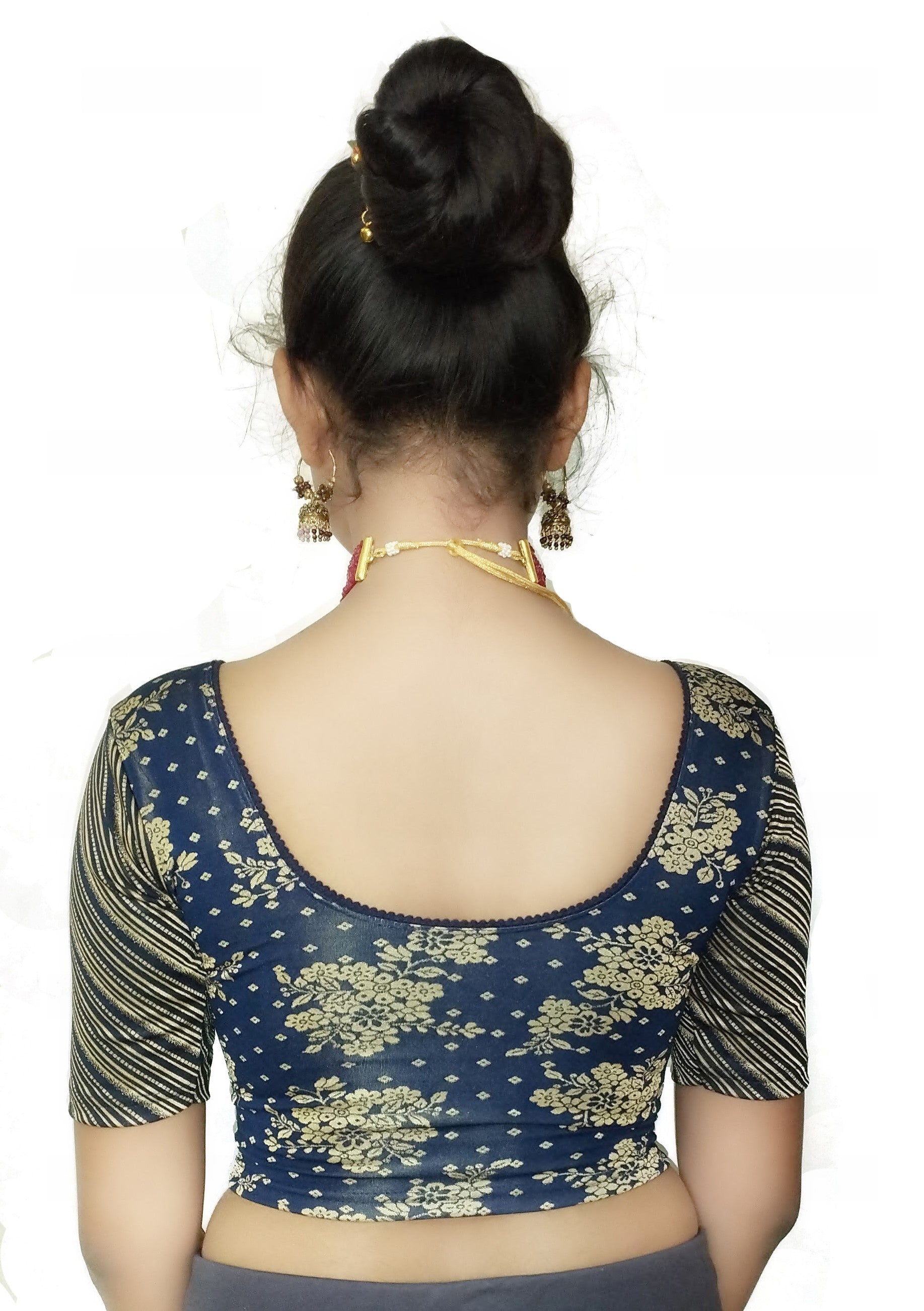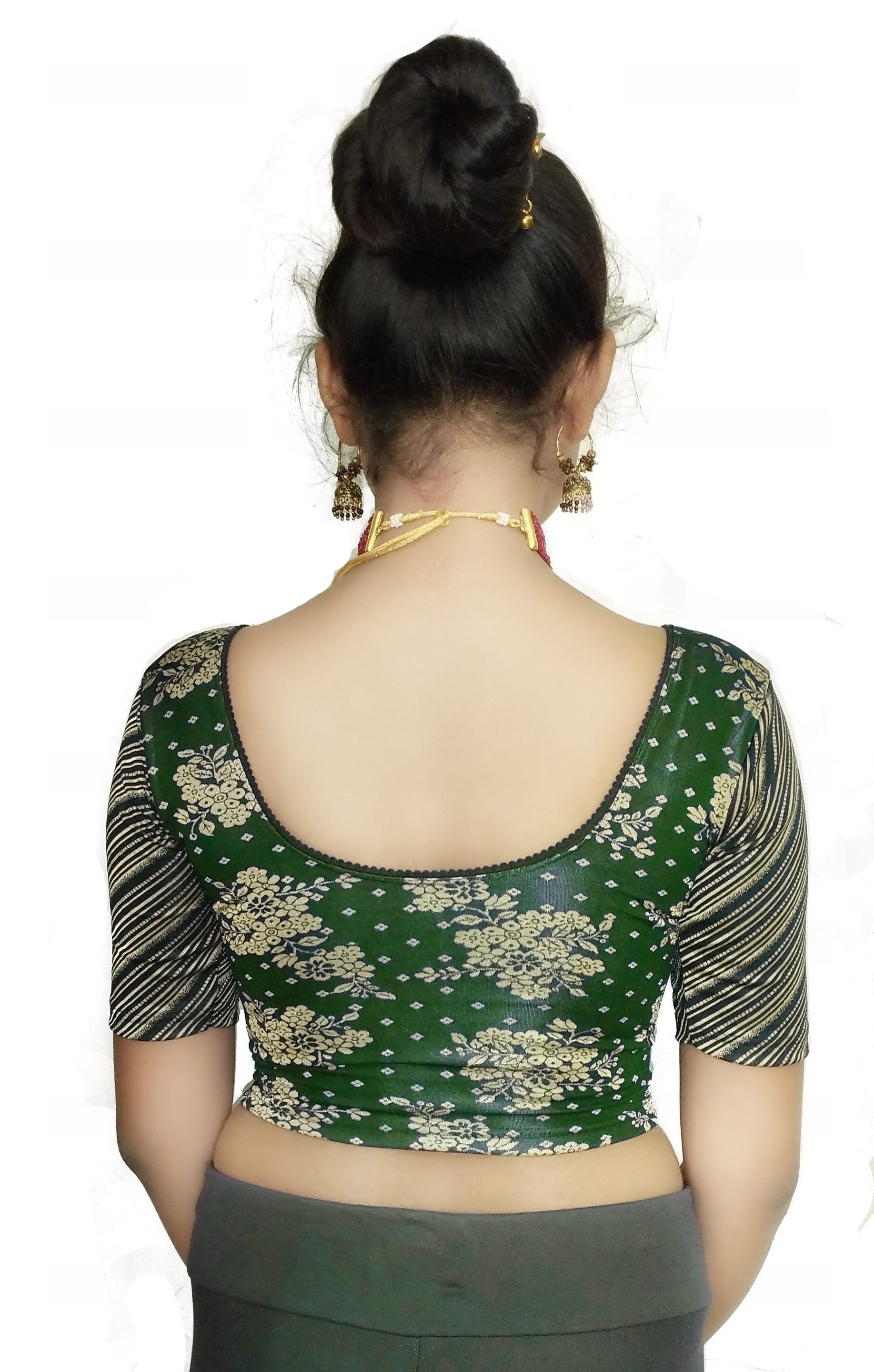 PU Fashion Jacquard Stretchable Saree Blouse – Floral Round Neck Short Sleeve Design